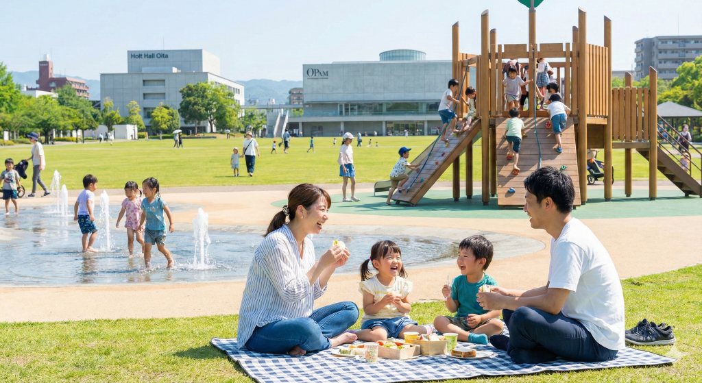 - 雨の日の逃げ場も充実: 雨の日は、駅の南側にある「ホルトホール大分」へ。こどもルームや図書館があり、室内でゆったり過ごせます。「大分県立美術館(OPAM)」も徒歩・自転車圏内で、幼い頃からアートに触れる機会を作れます。